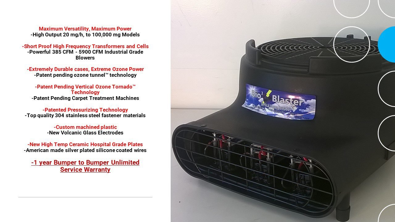These machines are the ideal multi position ozone workhorse high powered air-moving, carpet-drying, sanitizing, and deodorizing machines. Our technology is patented and that means no one else in the world has anything like them. They are ideal for fire and flood contractors to dry and sanitize flooded carpets and rugs.They can also be positioned to run in semi-vertical and full tornado modes. They are so powerful that they move over 1950 cfm’s of air and can even shoot ozone straight up to the ceiling of even a great room! They are becoming the machine of choice for more than just drying carpets. Many of our odor removal contractors are using these machines as the workhorses of their odor removal businesses! They generate massive amounts of gas and they move massive amounts of air they are perfect for a wide variety of contractor ozone applications, from odor removal to mold remediation to green pest control and bedbug removal.